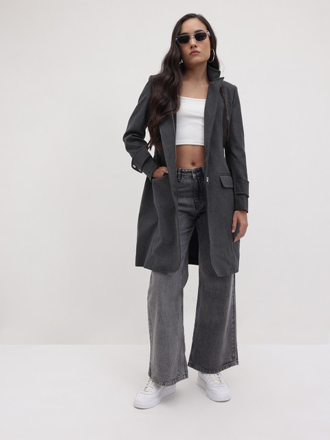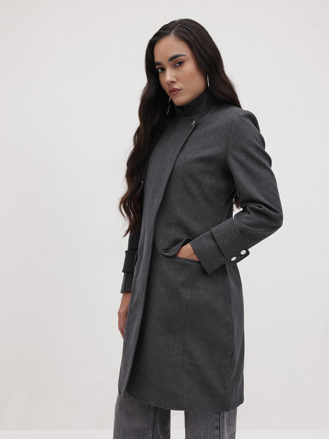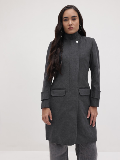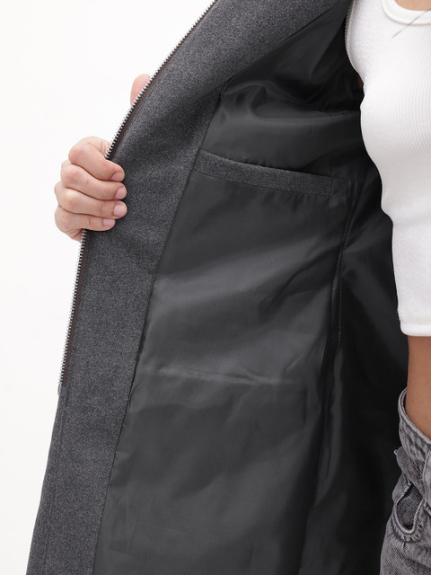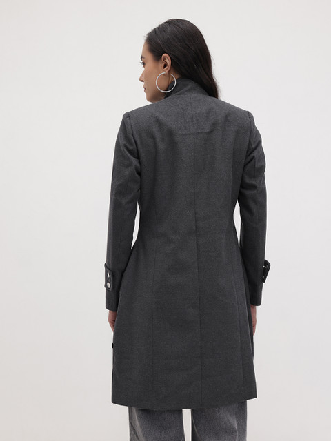 Charcoal Grey overcoat, has a notched lapel collar, long sleeves with tabs, zip closure and an overlapping snap button closure, 3 pockets