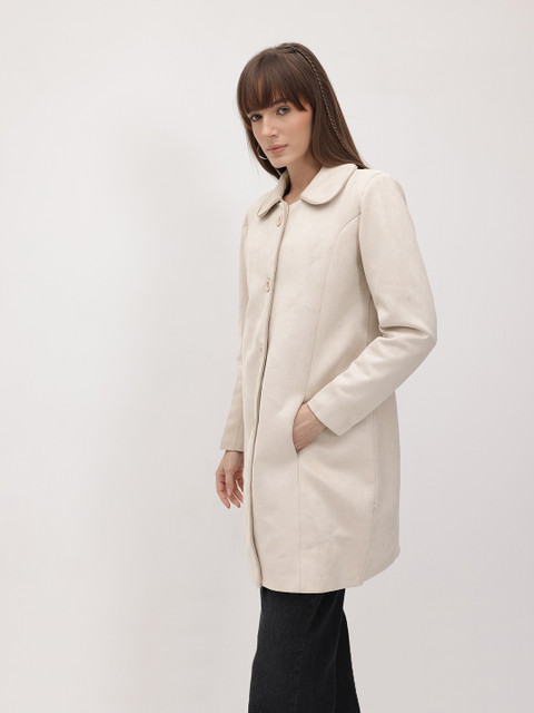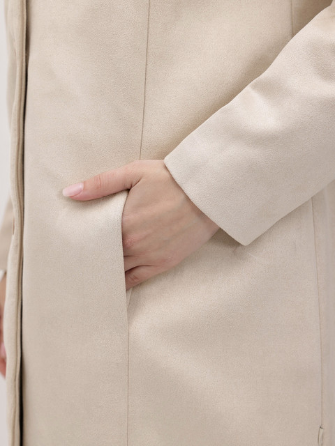 Beige solid suede finish overcoat, is single-breasted, has peter pan collar,  and three pockets, single vented hem