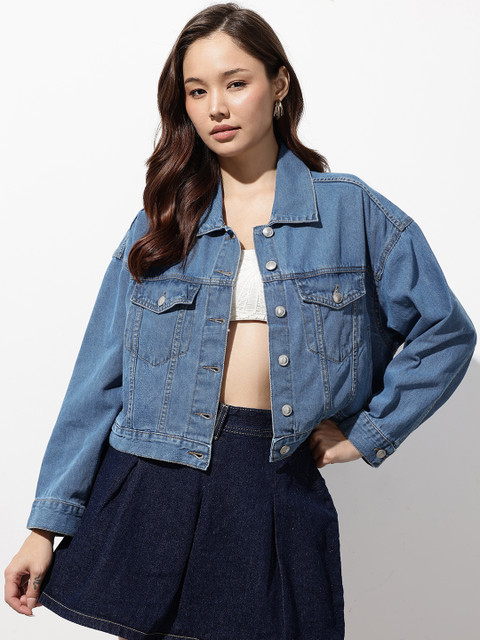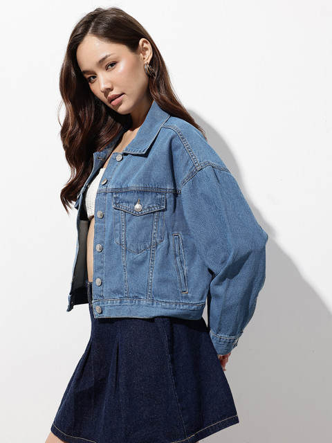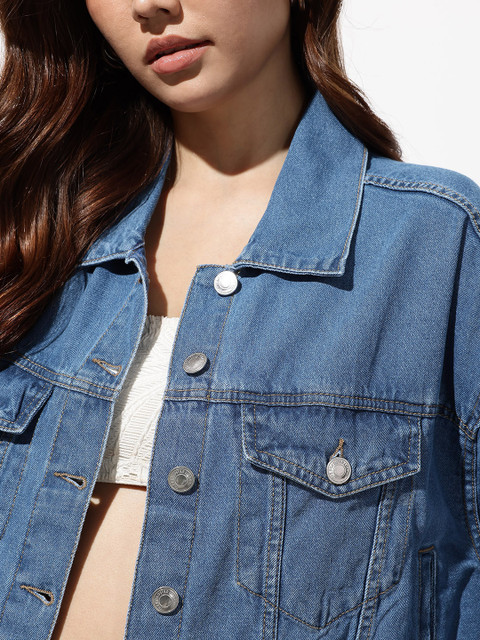 Blue washed solid denim jacket, has a spread collar, 4 pockets, has a button closure, long sleeves, straight hemline, cotton lining