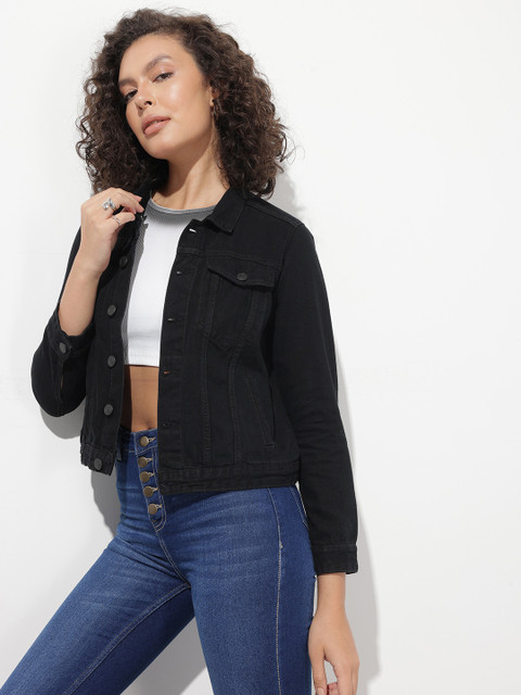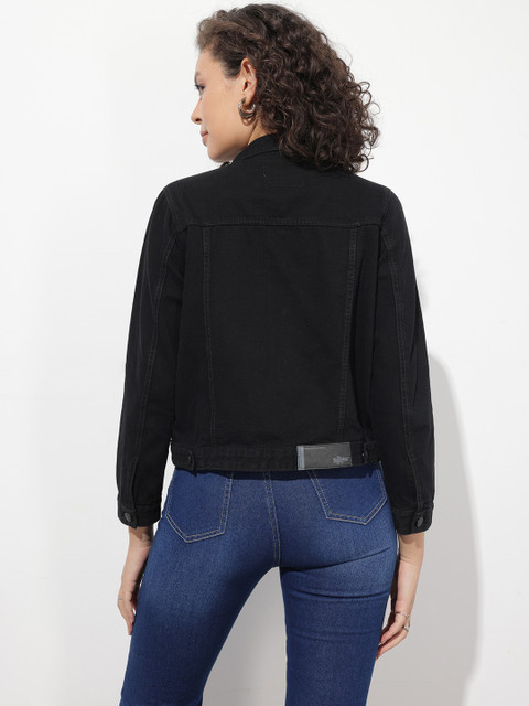 Black solid denim jacket with utility pockets, has a spread collar, 4 pockets, has a button closure, long sleeves, straight hemline