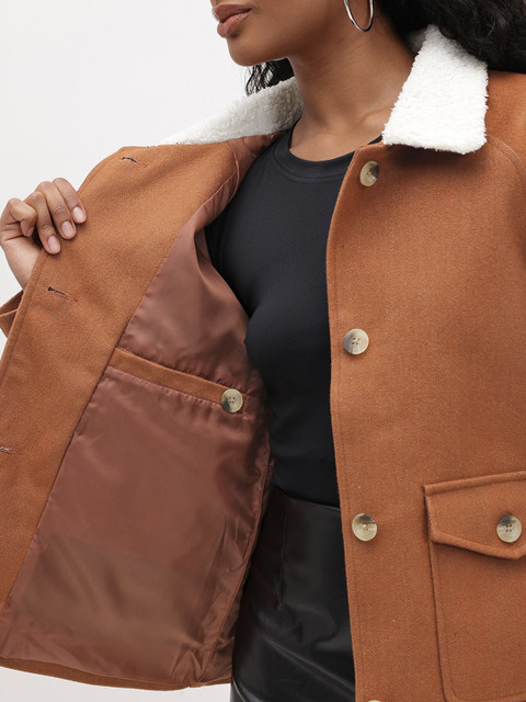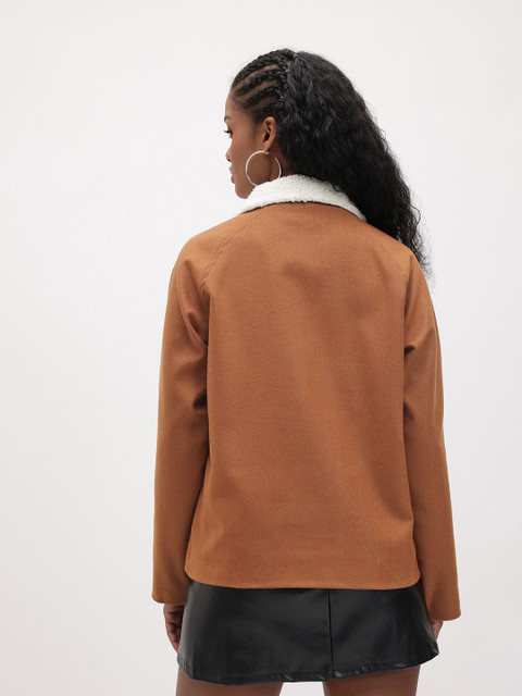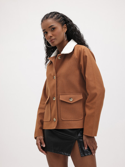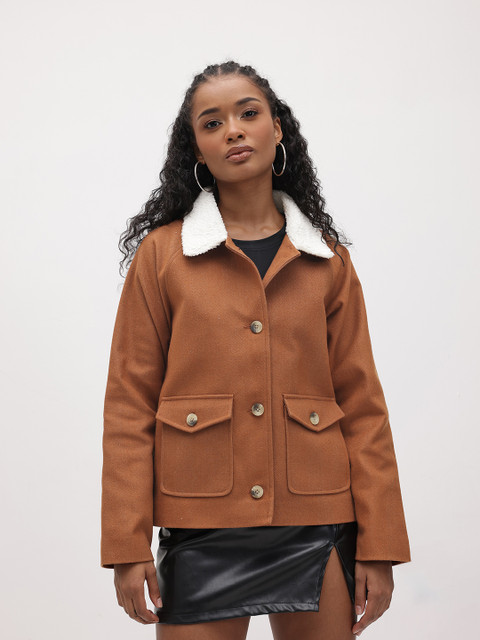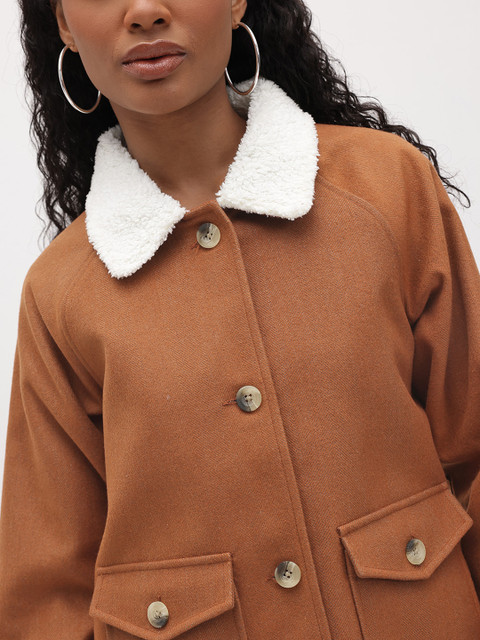 Brown and white solid parka coat, has a spread collar, long sleeves, 3 pockets, button closure, with polyester lining