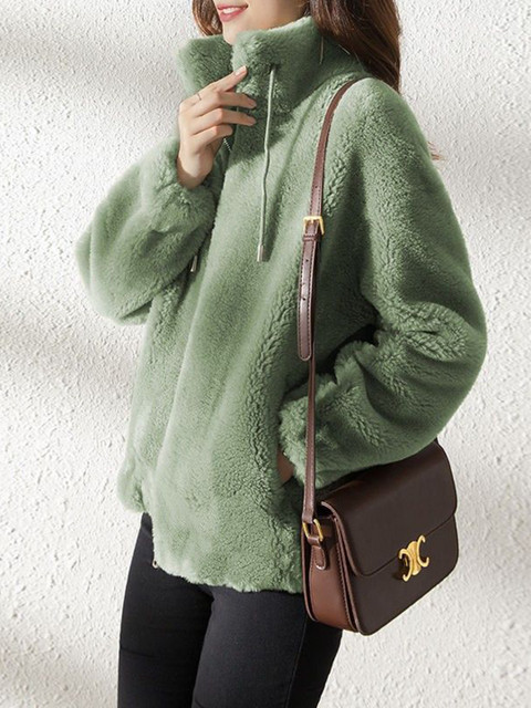 Green solid Sherpa jacket, has high neck, zip closure, long sleeves, straight hem, and two pockets
