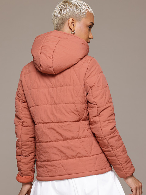 Coral solid padded jacket, has a hooded, 2 pockets ,has a zip closure, long sleeves, straight hemline, polyester lining
