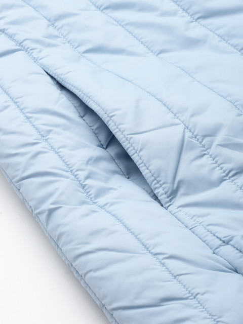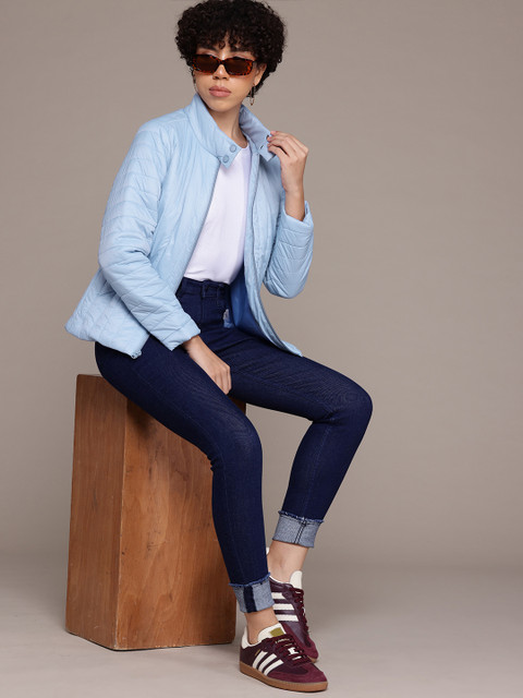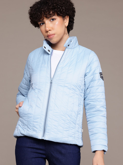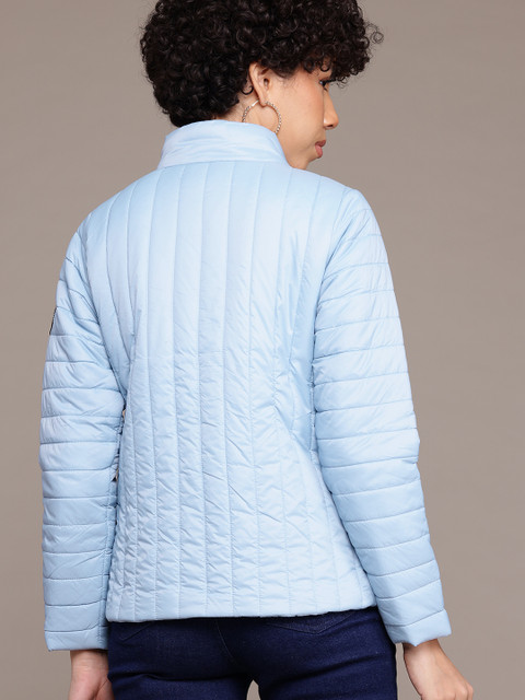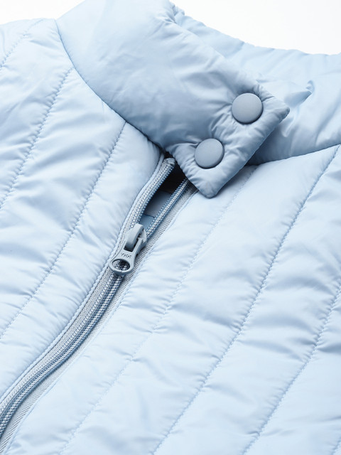 Blue solid padded jacket, has a mock collar, 3 pockets ,has a zip closure, long sleeves, straight hemline, polyester lining