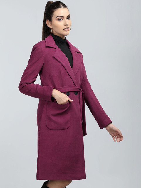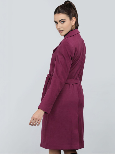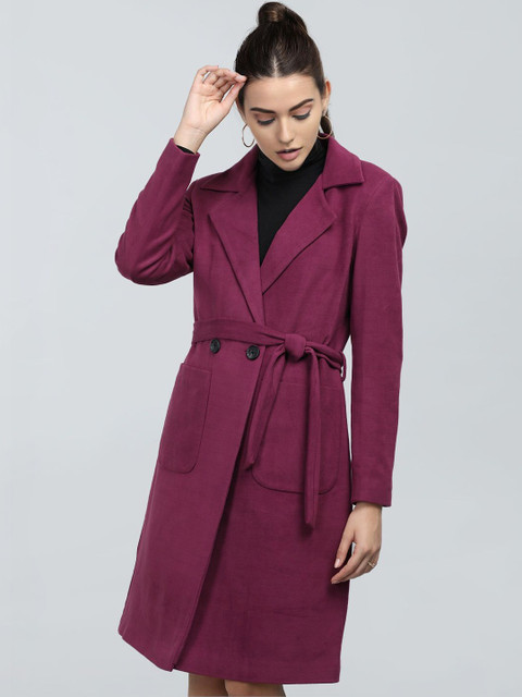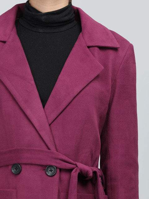 Purple colored solid double-breasted overcoat, has notched lapel collar, long sleeves, button closure, two pockets, a straight hem