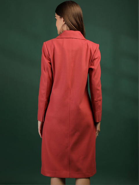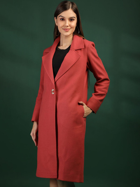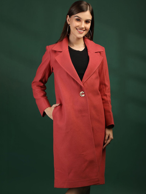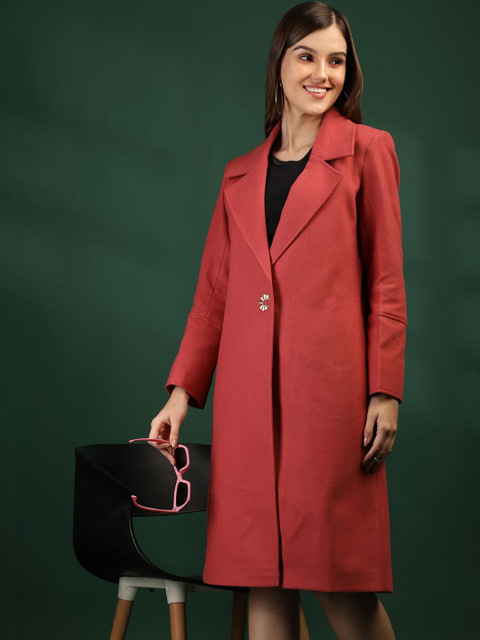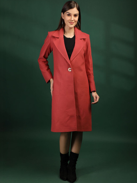 Pink solid single-breasted overcoat, has notched lapel collar, long sleeves, button closure, two pockets, a straight hem
