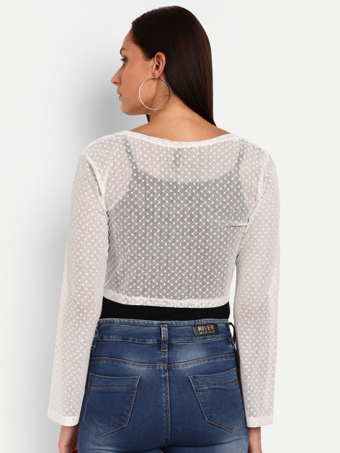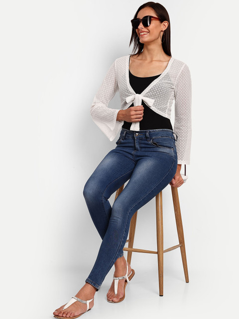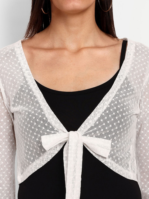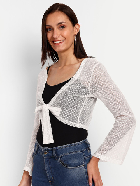 White self design tie-up crop shrug ,has long sleeves, asymmetric hem