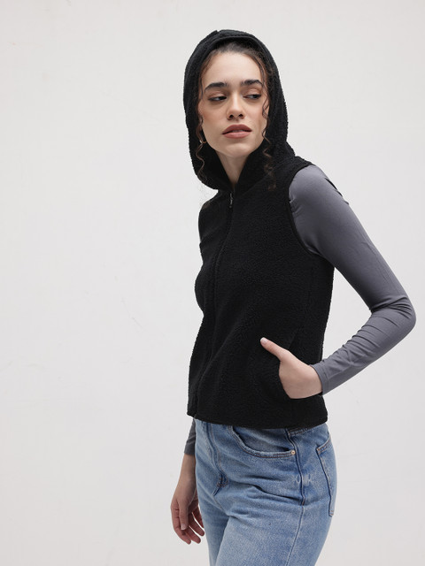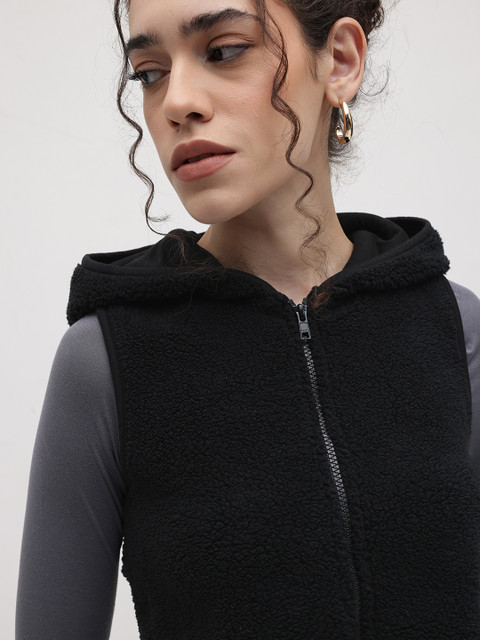 Black solid sherpa, has a hooded, pockets ,has a zip closure, sleeveless, straight hemline, without lining engineered with no