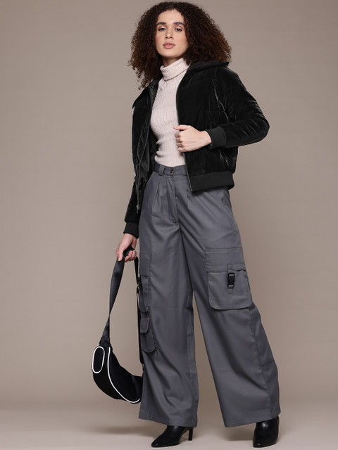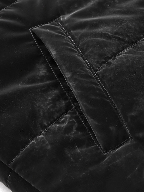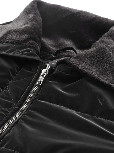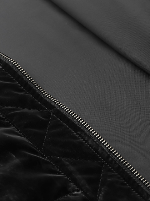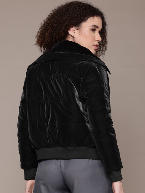 Black solid bomber jacket, has a spread collar, 2 pockets, has a zip closure, long sleeves, straight hemline