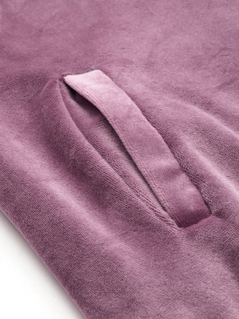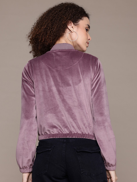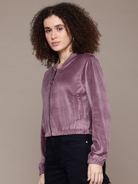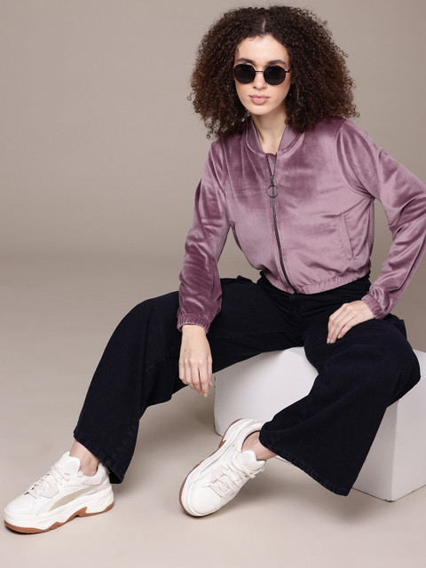 Purple solid velour bomber, has a stand collar, 2 pockets, a zip closure, long sleeves, and straight hemline