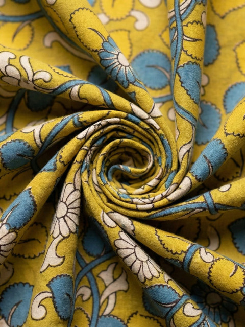 Yellow, blue and white printed pure cotton unstitched kurta fabric