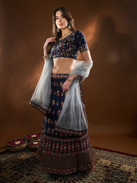 Blue and pink embroidered unstitched blouse, has a v-neck, three-quarter sleeves, blue and pink embroidered semi-stitched lehenga, has slip-on closure, curved hem