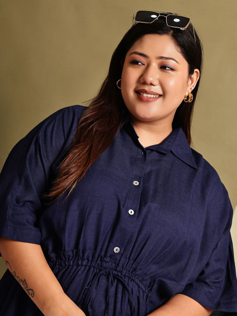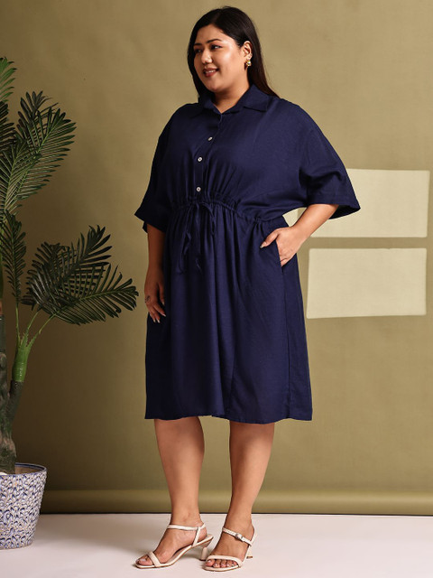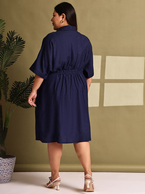 theRebelinme Women Plus Size Shirt Collar Kimono Sleeve A-Line Midi Dress