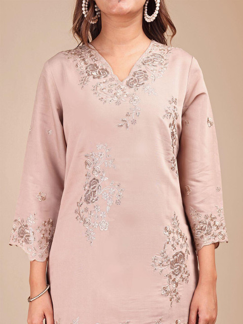 Beige-colored embroidered tunic has V-neck and three-quarter sleeves with slip on closure