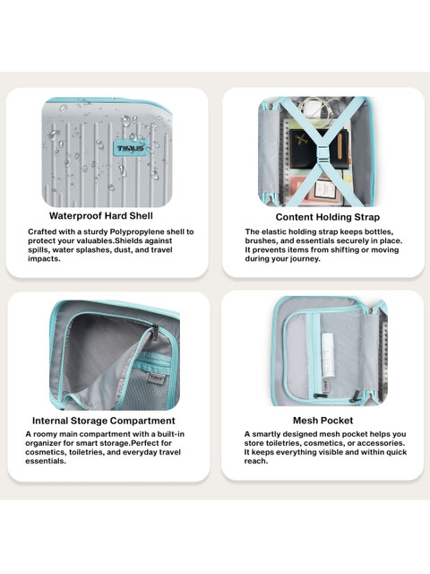 Hard Shell Protection: Strong polypropylene exterior shields belongings from bumps, spills, and moisture while traveling. Travel-Friendly Design: Back trolley sleeve fits securely over suitcase handles for hassle-free travel. Organized Interior: Includes a mesh pocket, elastic holding strap, main compartment, and organizer space to store essentials neatly. Lightweight & Compact: Weighs only 760g with a 7.2L capacity, ideal for toiletries, makeup, grooming tools, or travel accessories. Modern & Stylish: Sleek finish complements any travel setup and looks premium on the go.