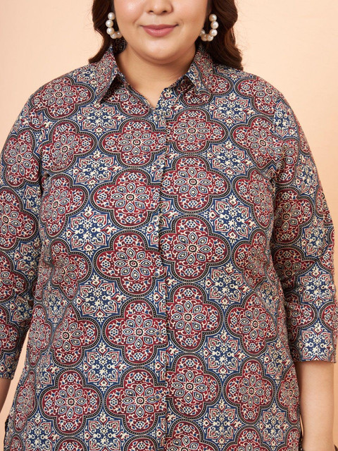 Brown & red floral printed shirt, has a shirt collar neck and three-quarter sleeves, Secured with button closure