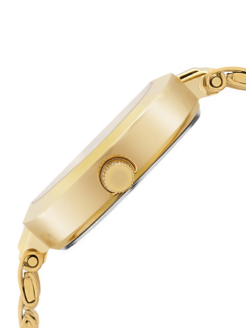 This elegantly crafted accessory brings a timeless charm to your wrist with its champagne-toned round dial and refined golden stainless steel strap. The soft sunray finish of the dial is enhanced by a tasteful crystal detail that adds a hint of sparkle. A polished brass case and mineral glass ensure durability, while the sleek strap fastens securely with a three-piece sliding clasp. Its design makes it an ideal piece for both professional attire and festive looks. Reliable craftsmanship meets everyday sophistication in this graceful timepiece.