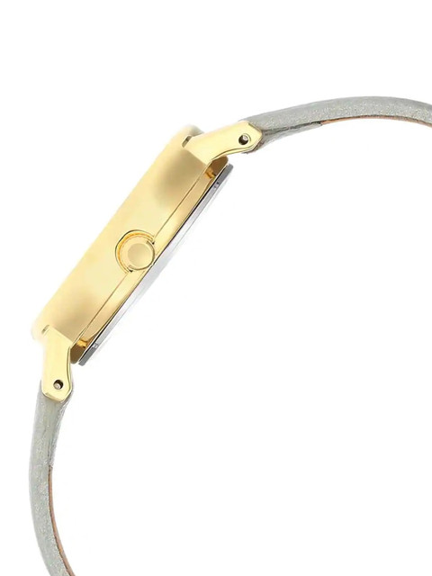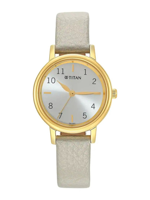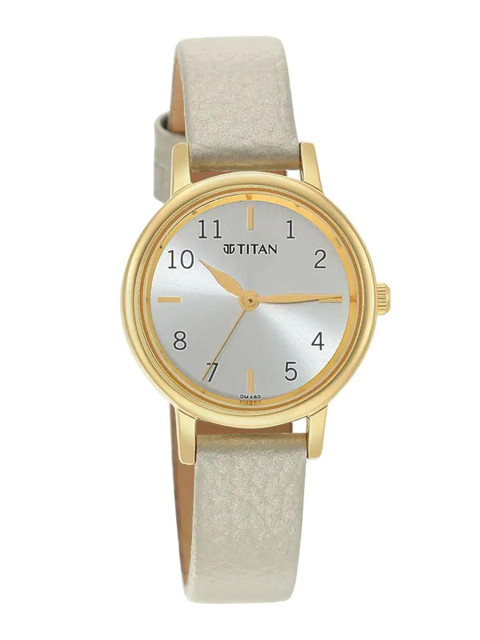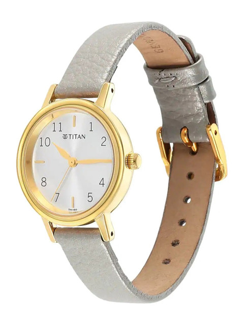 Gracefully minimal yet refined, this Titan Karishma watch is tailored for women who prefer understated elegance. Featuring a sunray silver dial housed in a gold-toned case, the watch blends timeless charm with a modern twist. The slim grey leather strap adds a soft contrast and ensures comfortable wear throughout the day. With its clean hour markers and classic hands, this accessory seamlessly complements both everyday looks and festive occasions with quiet sophistication.