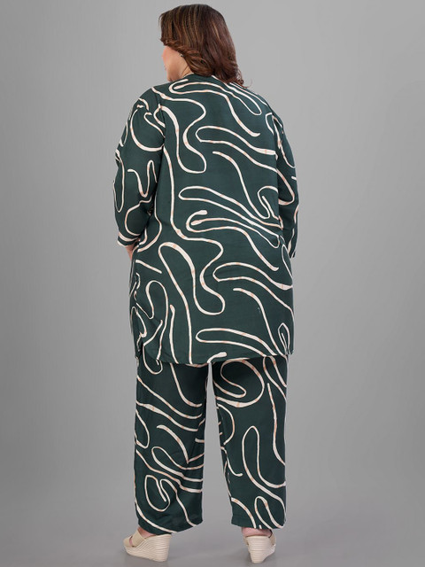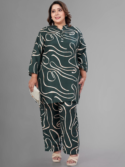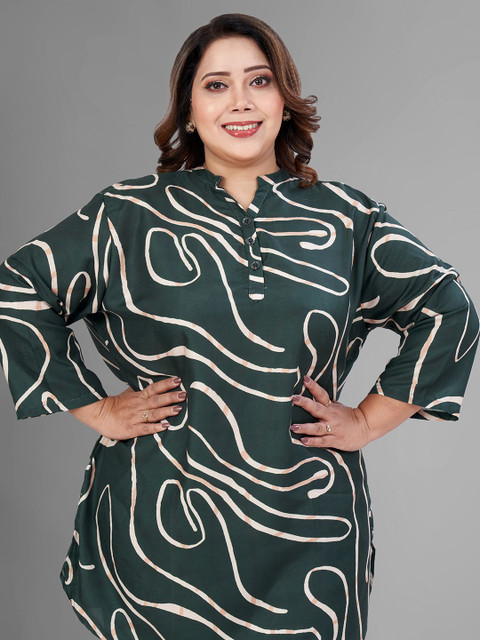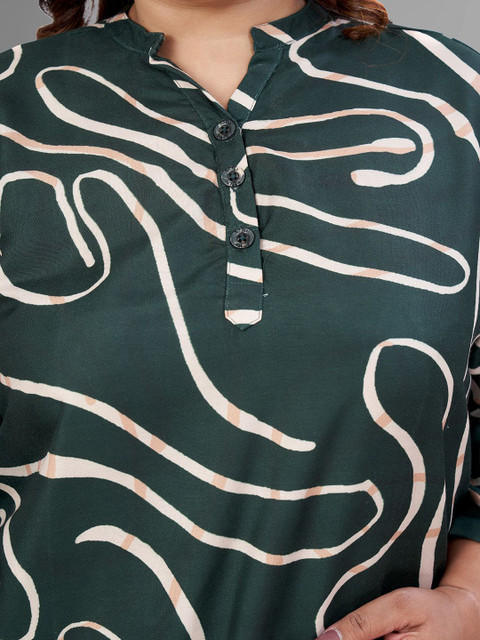 Green and gold abstract printed tunic, has mandarin collar, three-quarter sleeves, button closure and regular waist hem