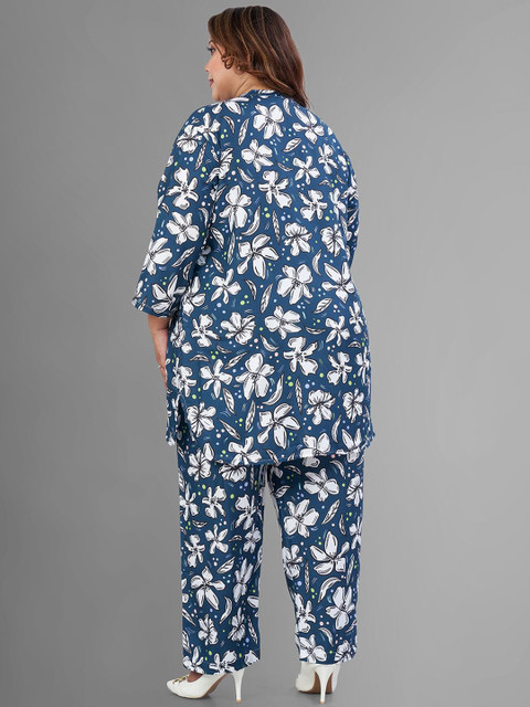 Blue and white floral printed tunic, has mandarin collar, three-quarter sleeves, button closure and regular waist hem