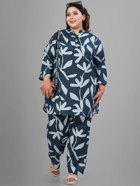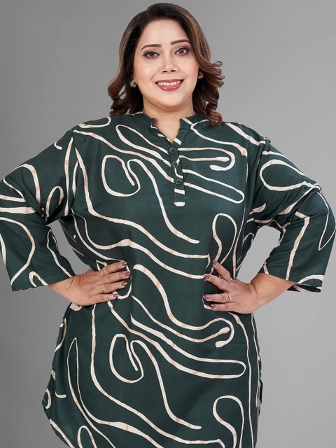Beige and green printed tunic, has a mandarin collar and three-quarter sleeves
