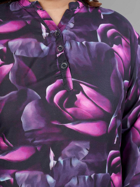 Purple and pink printed tunic, has a mandarin collar neck and three-quarter sleeves, secured with button closure