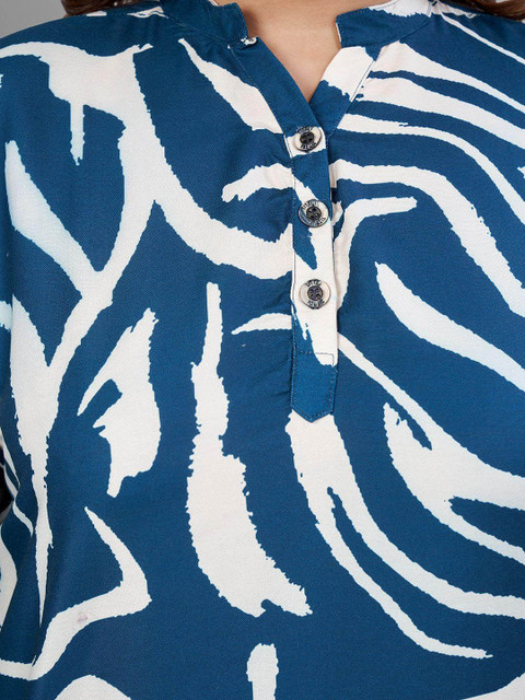 Blue and white printed tunic, has a mandarin collar neck and three-quarter sleeves, secured with button closure