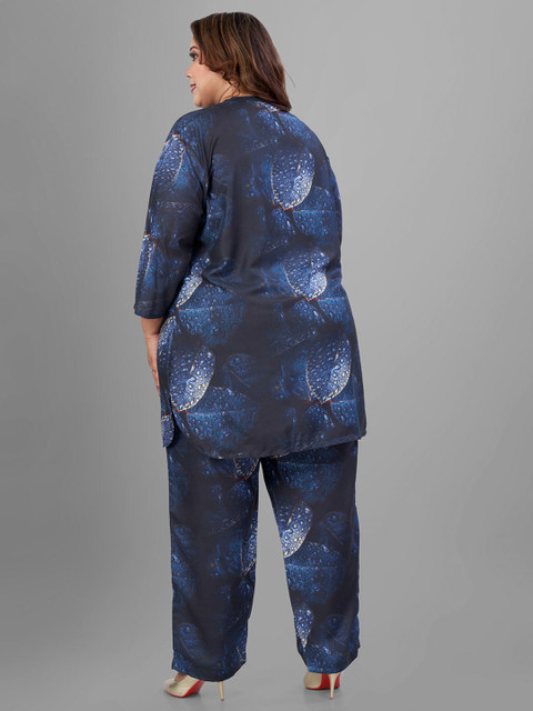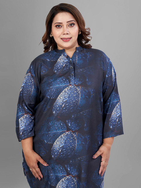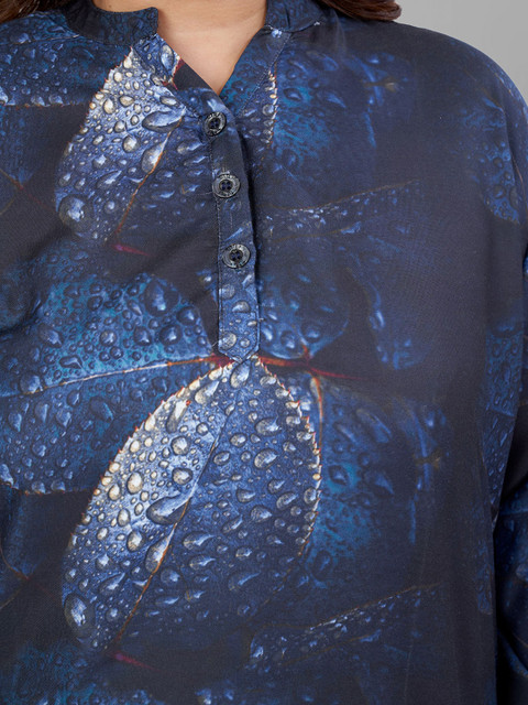 Blue and white printed tunic, has a mandarin collar neck and three-quarter sleeves, secured with button closure