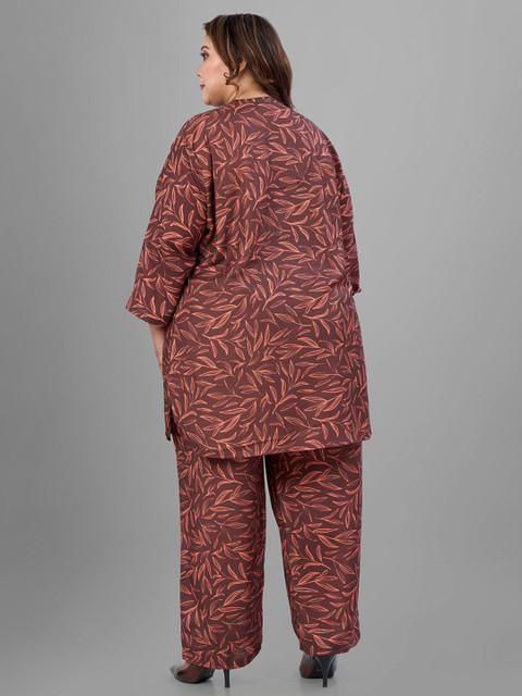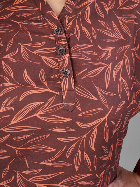 Brown printed tunic, has a mandarin collar neck and three-quarter sleeves, secured with button closure
