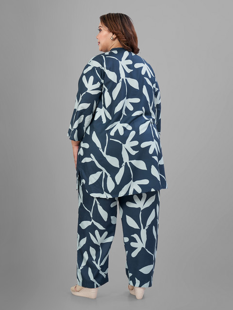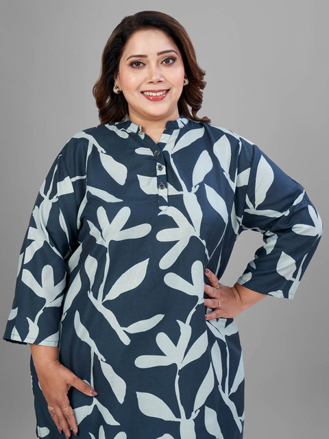 Blue printed tunic, has a mandarin collar neck and three-quarter sleeves, secured with button closure