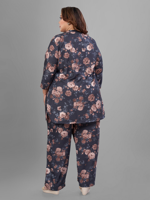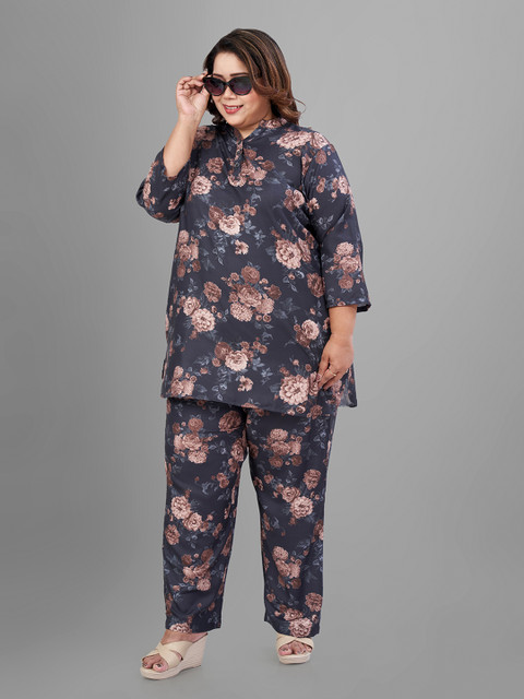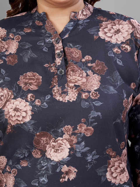 Navy blue and brown printed tunic, has a mandarin collar neck and three-quarter sleeves, secured with button closure