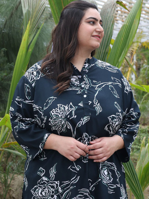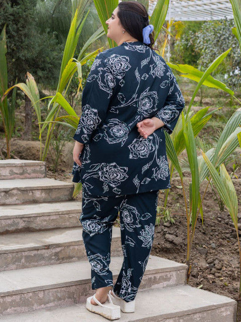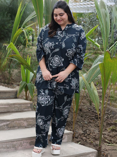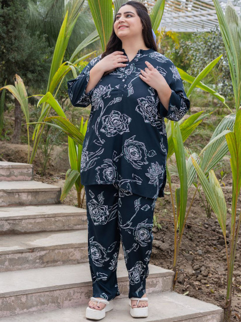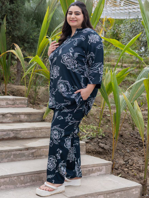 Check out the Tittli Plus Size Co-ord Set, made just for plus-size womens in 3XL, 4XL, and 5XL! Its got a cool digital print on soft Rayon fabric thats light but not see-through. The set comes with a tunic top that has a neat mandarin collar with three buttons, and comfy pajama trousers with pockets on both sides. Throw on some simple gold jewelry, cute sandals, and a small bag to finish off your lookperfect for chilling or stepping out!