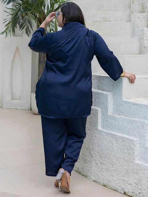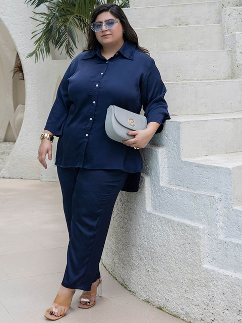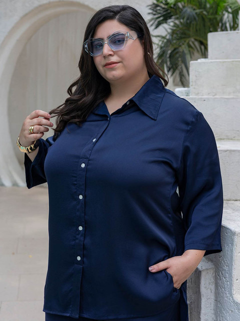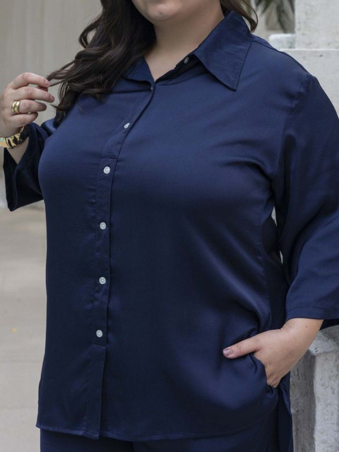Navy Blue Shirt, has a collar, and button opening Shirt with high low hemline and long sleeves.