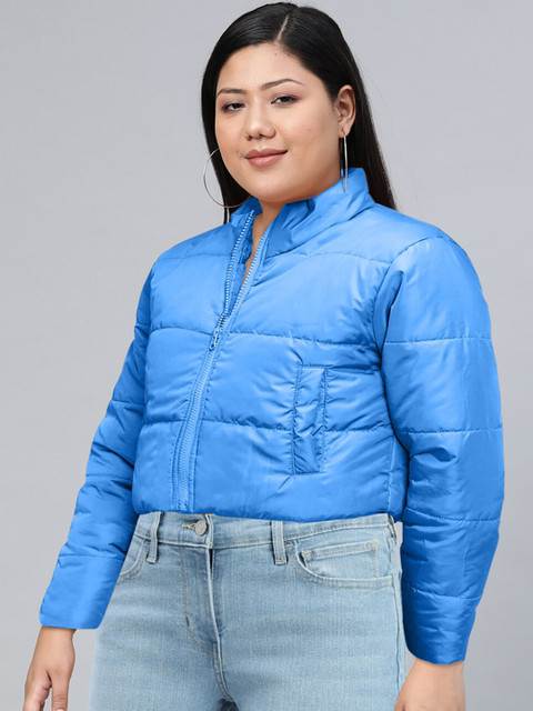 Blue solid crop puffer jacket, has a stand collar, 2 pockets, has a zip closure, long sleeves, straight hemline