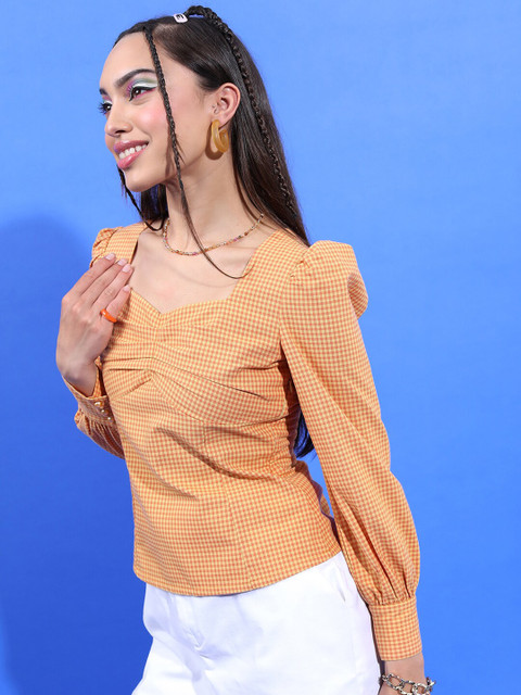 3 reviews for Tokyo Talkies Checked Sweetheart Neck Puff Sleeves Top