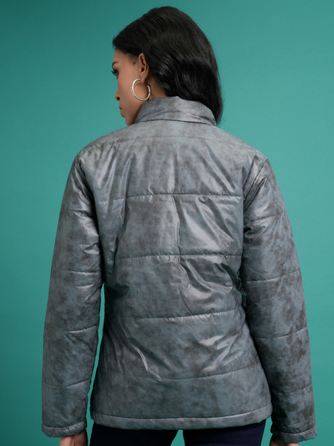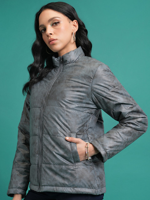 Grey solid puffer jacket, has a stand collar, 2 pockets ,has a zip closure, long sleeves, straight hemline, without lining