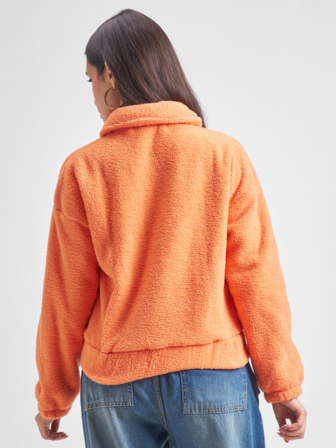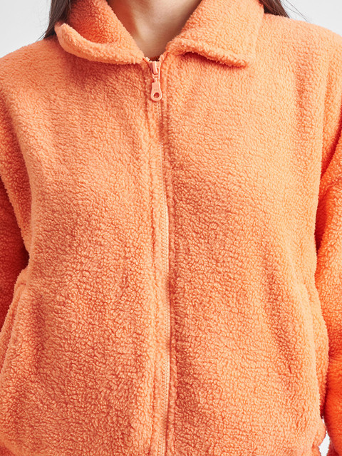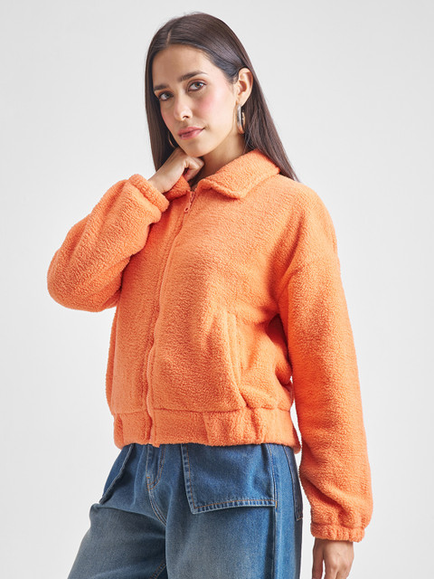 Orange solid bomber jacket, has a spread collar, 2 pockets ,has a zip closure, long sleeves, straight hemline
