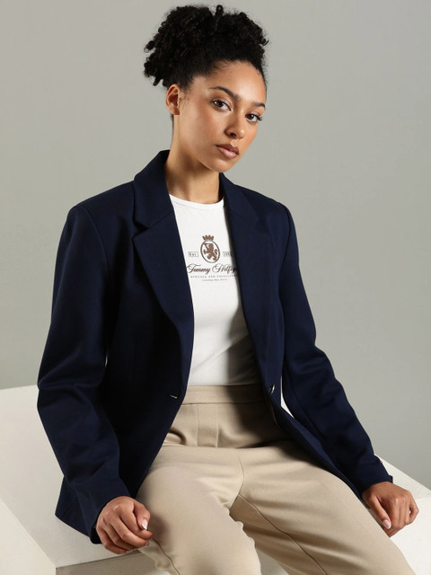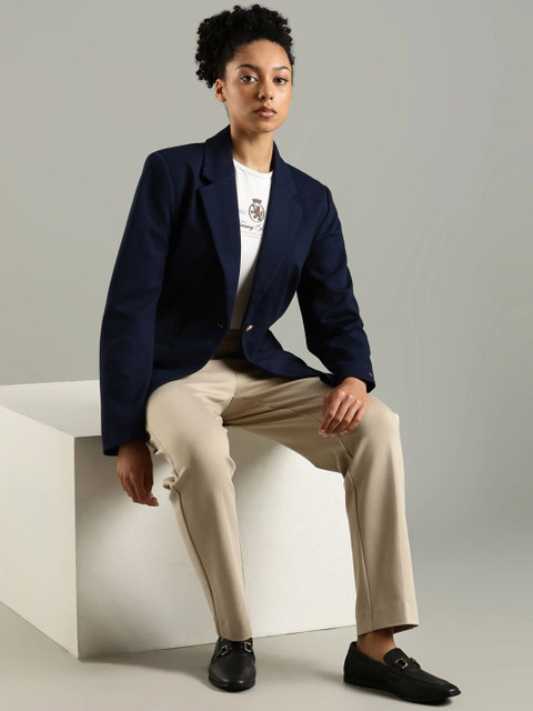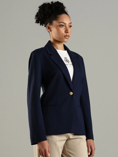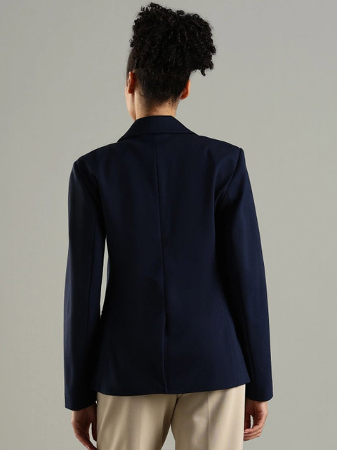 Navy blue solid casual blazer, has a notched lapel, long sleeves, single-breasted with double button closure, two flap pockets, one welt pocket and a double-vented back hem