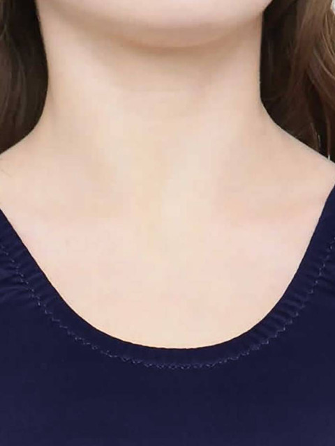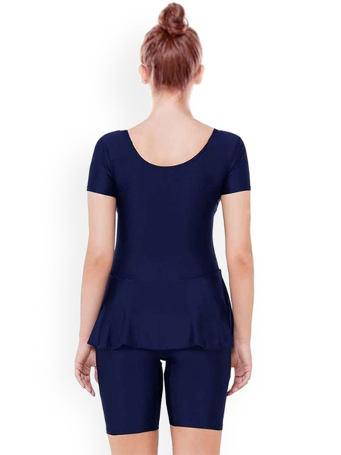 Blue solid swimming dress, has a round neck, short sleeves, and attached shorts