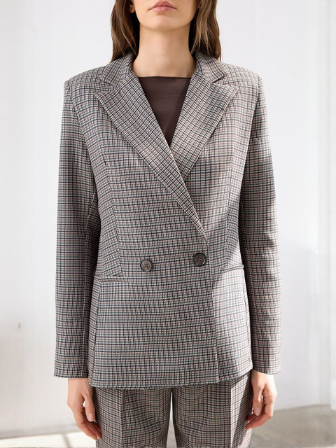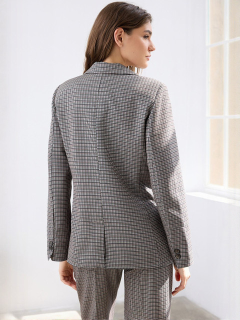 Grey and black checked regular-fit smart-casual blazer, has a notched lapel collar, long sleeves, double-breasted with double button closure, two flap pockets and a single vent back hem
