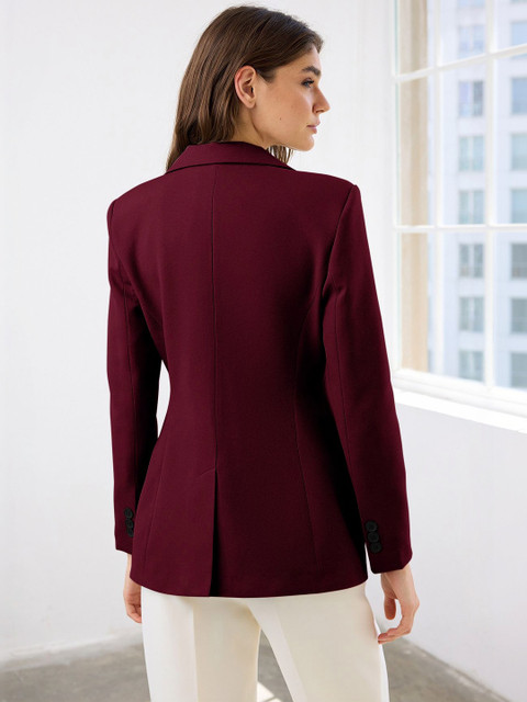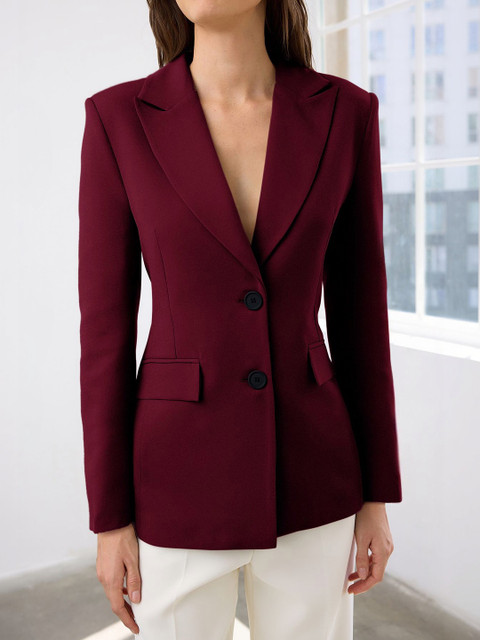 Maroon solid smart-casual blazer, has a notched lapel, long sleeves, single-breasted with double button closure, two flap pockets, one welt pocket and a double-vented back hem