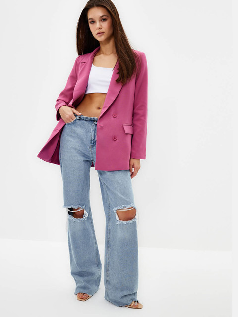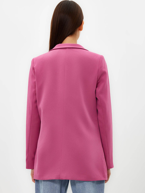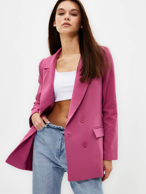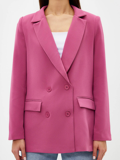 Pink regular-fit casual blazer, has a notched lapel, long sleeves, double-breasted with double button closure, two flap pockets, one welt pocket and a ventless back hem
