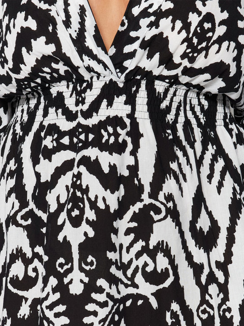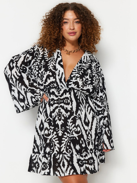 - Black and white ethnic motifs printed plus size fit & flare mini dress
