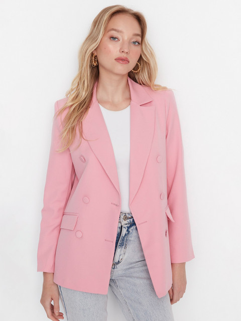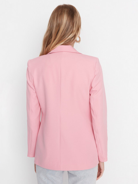 Pink solid regular-fit casual blazer, has a notched lapel, long sleeves, single-breasted with double button closure, two flap pockets, one welt pocket and a single-vented back hem