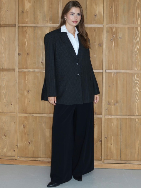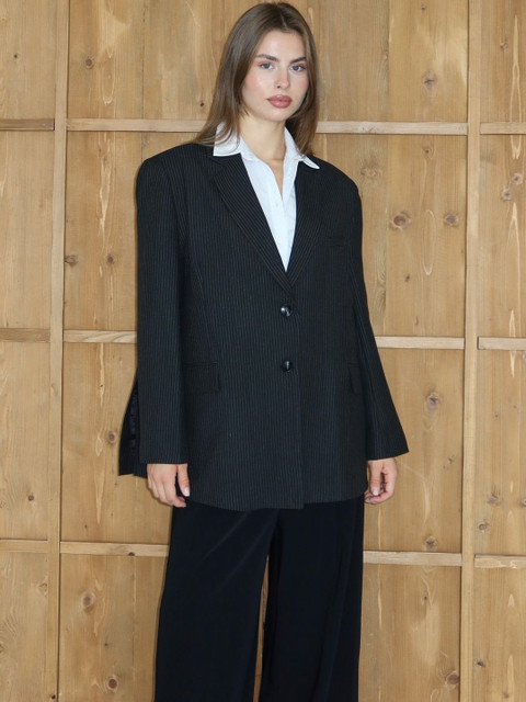 Navy blue and white striped regular-fit smart-casual blazer, has a notched lapel collar, long sleeves, single-breasted with double button closure, two flap pockets, one welt pocket and a double vent back hem