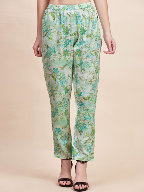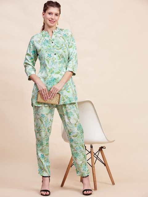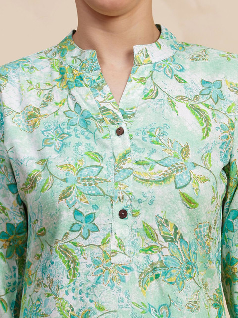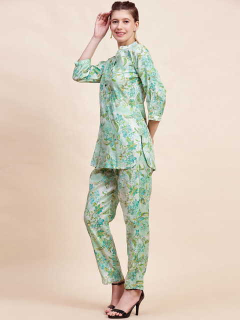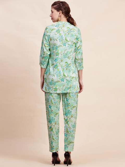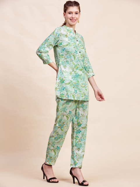 Green and white printed co-ords consist of a tunic and trousers. The tunic features a mandarin collar and three-quarter sleeves, while the trousers have a slip-on closure.