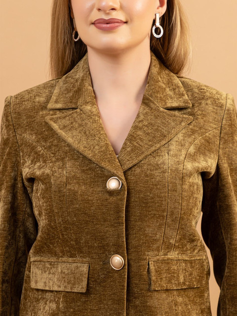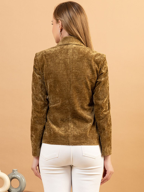 Beige and gold-toned solid blazer, has a notched lapel, long sleeves, single-breasted with double button closure, two flap pockets, one welt pocket and a double-vented back hem
