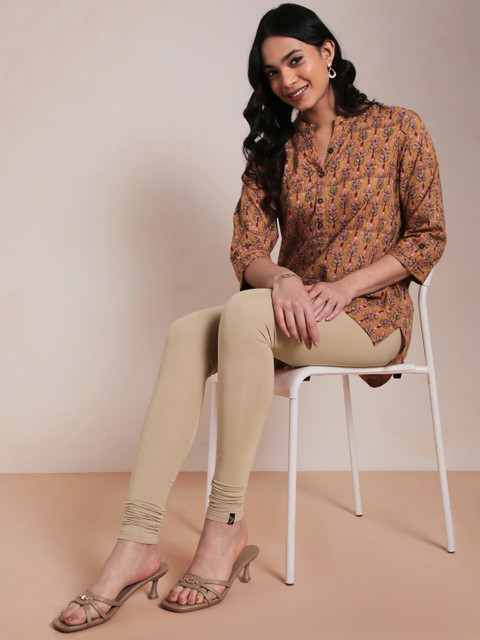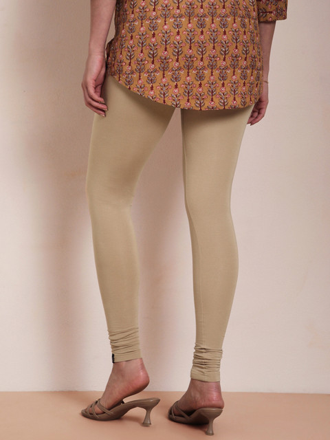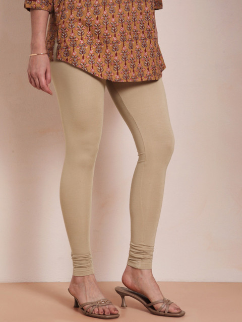 A pair of beige solid churidar-length leggings, has an elasticated waistband, and slip-on closure