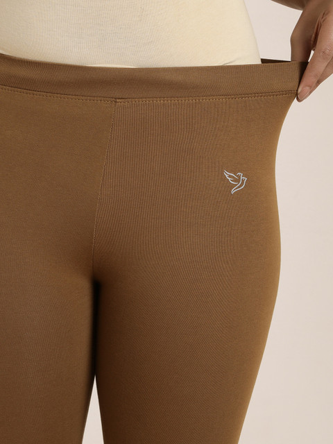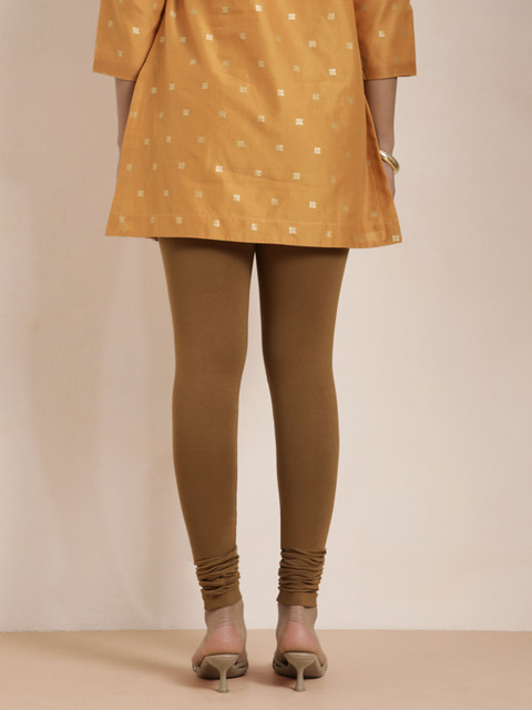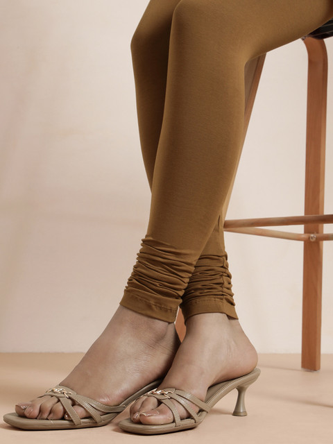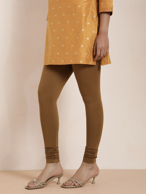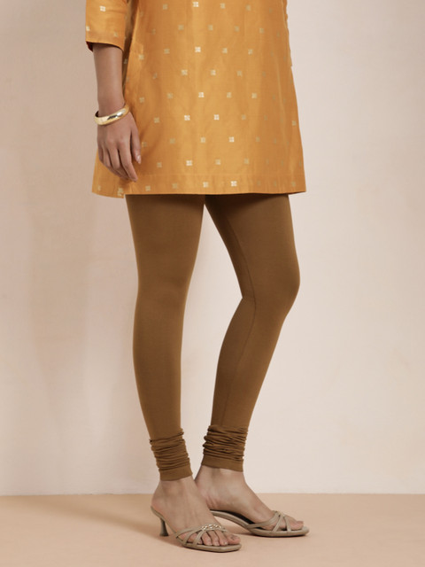 Brown solid churidar-length leggings, has an elasticated waistband, and slip-on closure