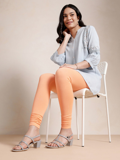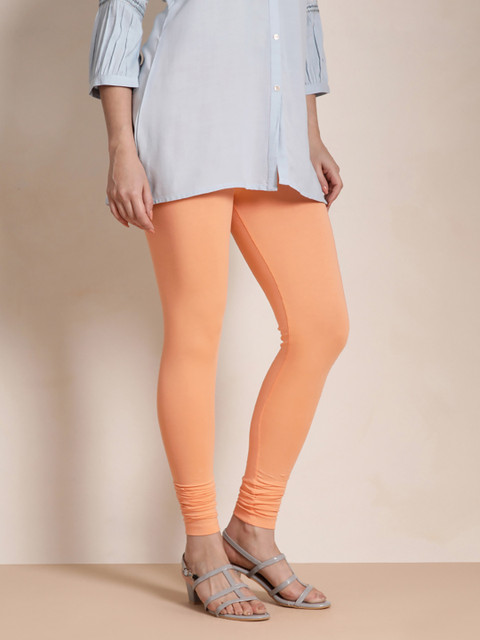 Peach-coloured solid churidar-length leggings, has an elasticated waistband, and slip-on closure
